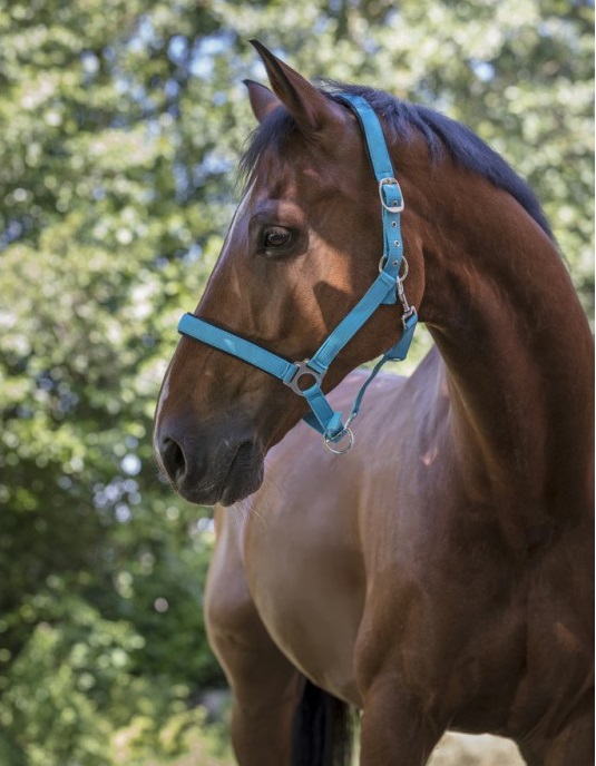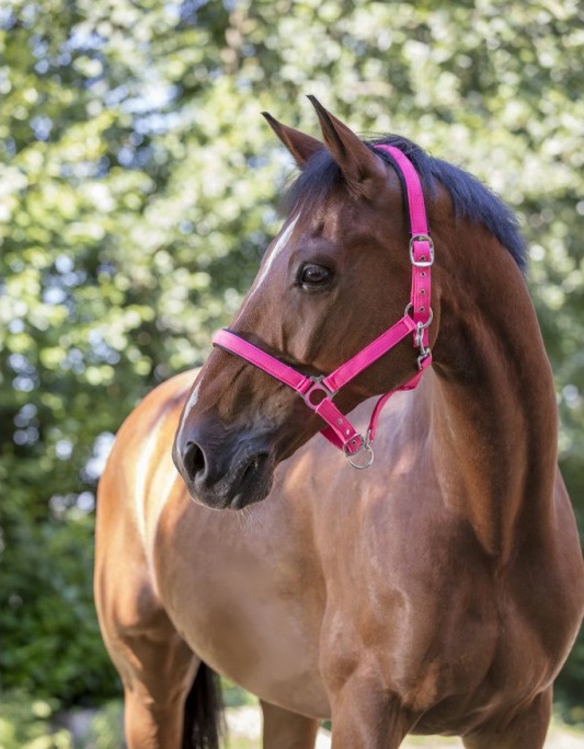 Яркий недоуздок с подложкой. Недоуздок выполнен из прочного нейлона. Крепкая стальная фурнитура.