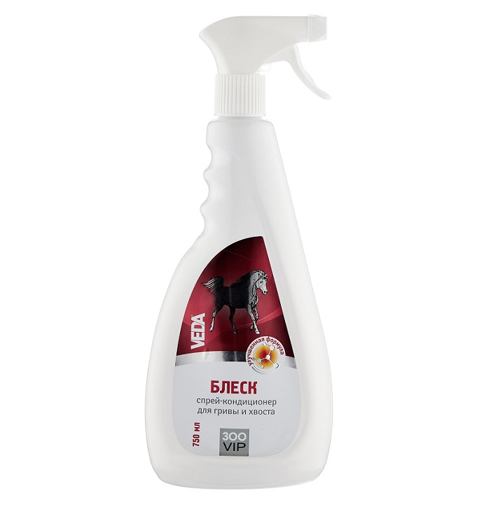 Производитель: Веда, Россия. Предназначен для использования в качестве шоу-косметики, а также для постоянного ухода за лошадью. Удаляет загрязнения и колтуны, придает волосу богатый выставочный блеск и насыщенный окрас. Волосы, обработанные спреем БЛЕСК, находятся в шоу-кондиции в течении 7-10 дней. Использование спрея-кондиционера облегчает груминг, экономит время при подготовке к выставке. Объем: 750 мл.