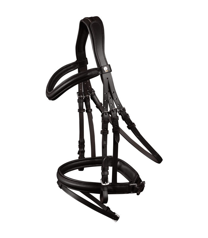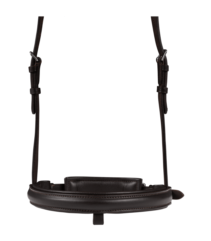 Классическая уздечка с самозатягивающимся съемным капсулем из высококачественной мягкой кожи. Хромированная фурнитура серебристого цвета на пряжках. Носовой, налобный и затылочный ремни с мягкой подложкой. В комплект входит тесьмяный повод.